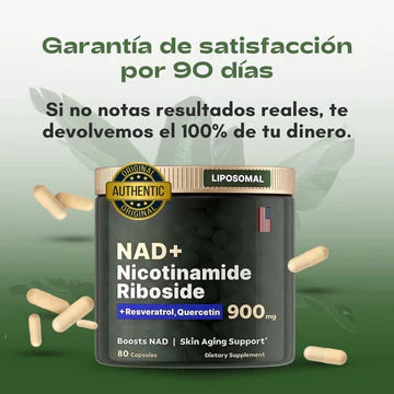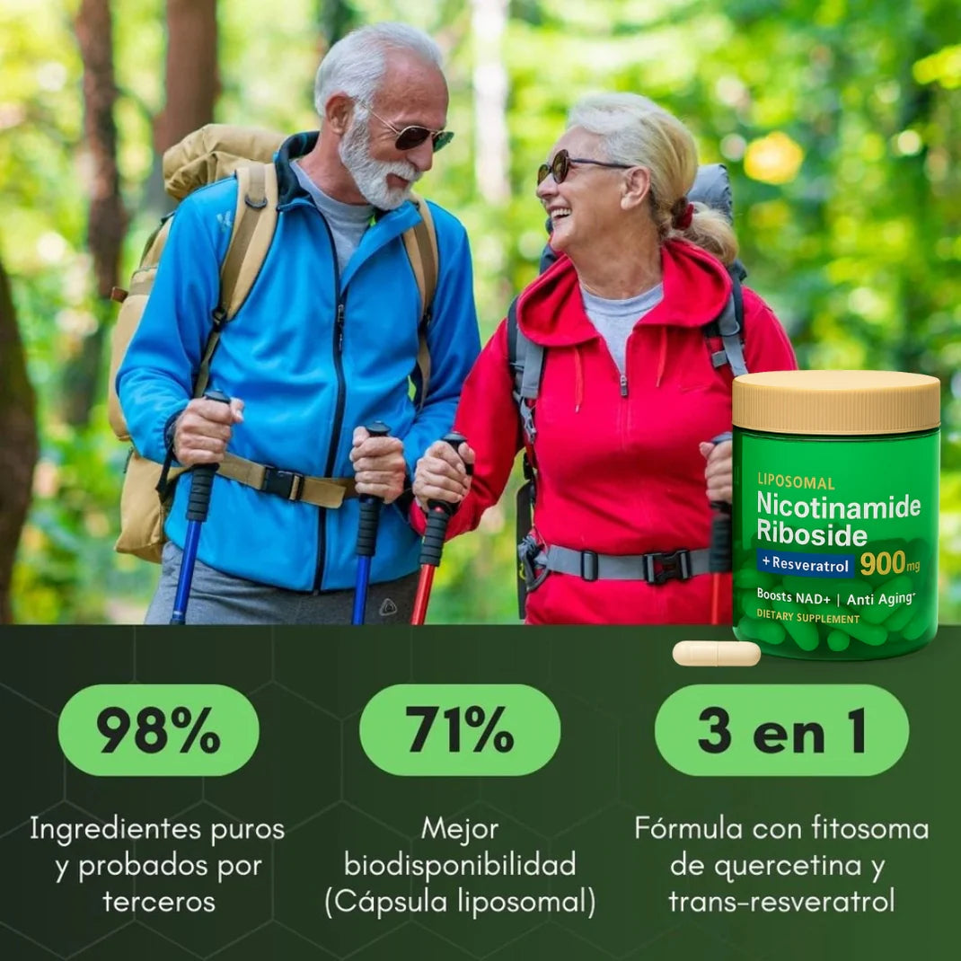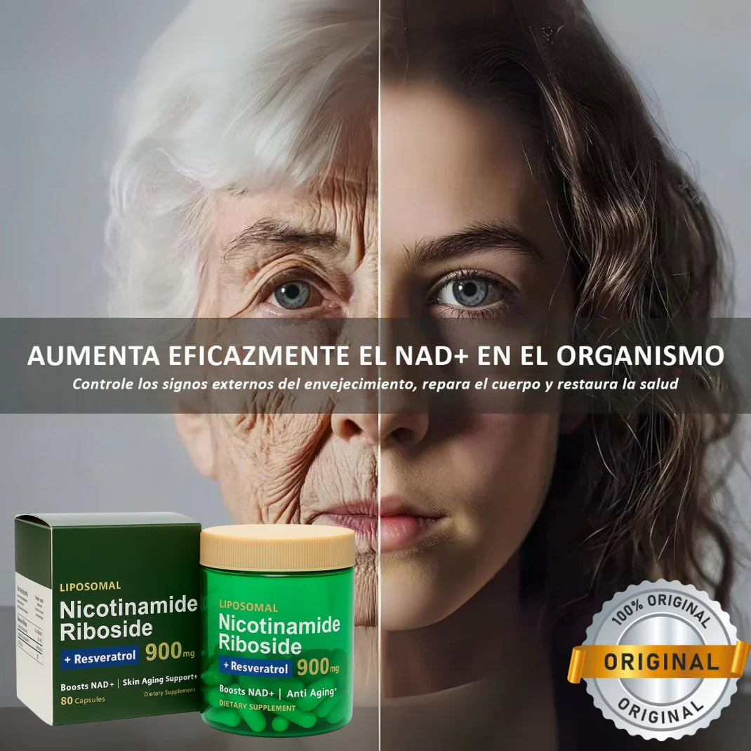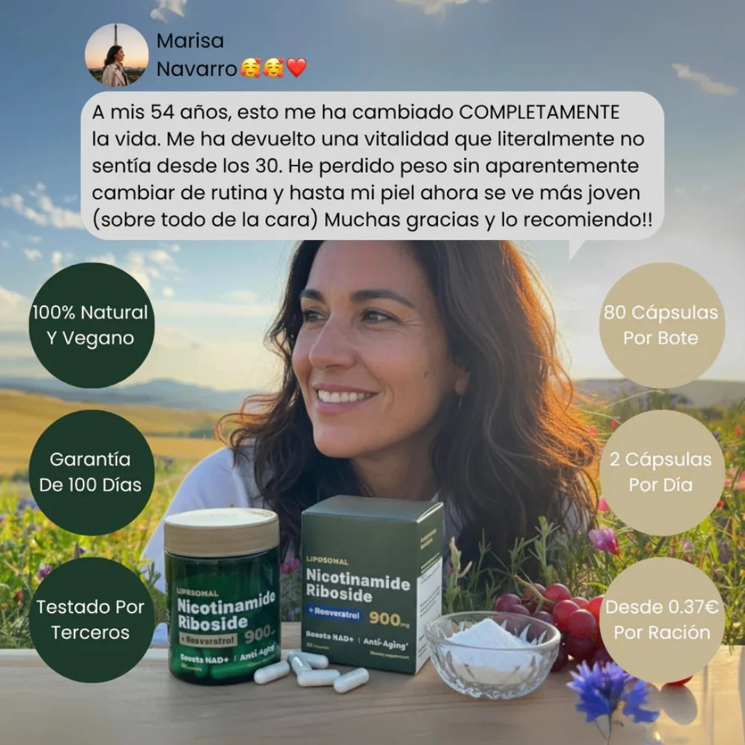 Gracias a su combinación de NAD+ y Resveratrol puro, restaura tus células, mejora la reparación del ADN y promueve una longevidad real y comprobada. 🔬